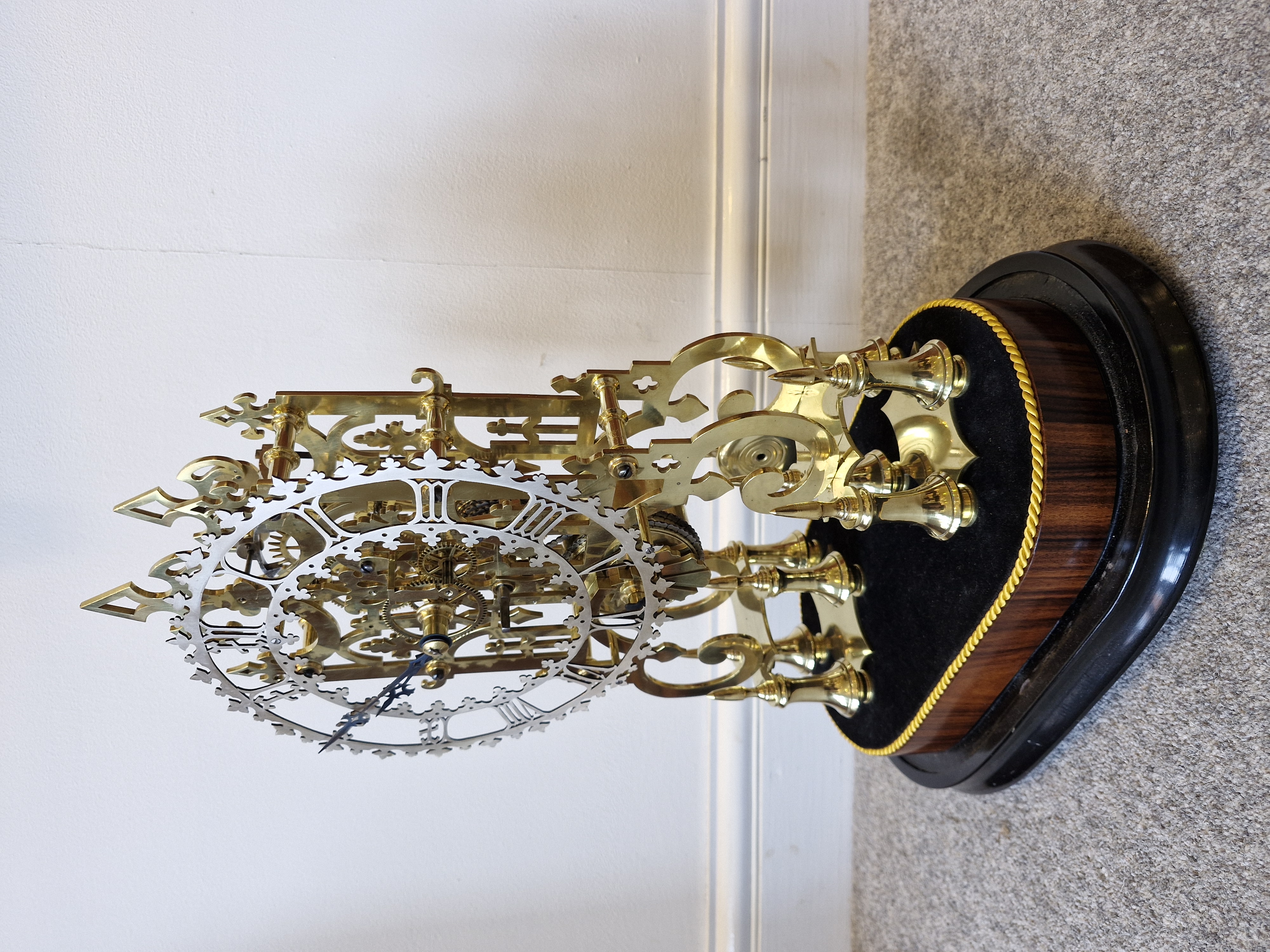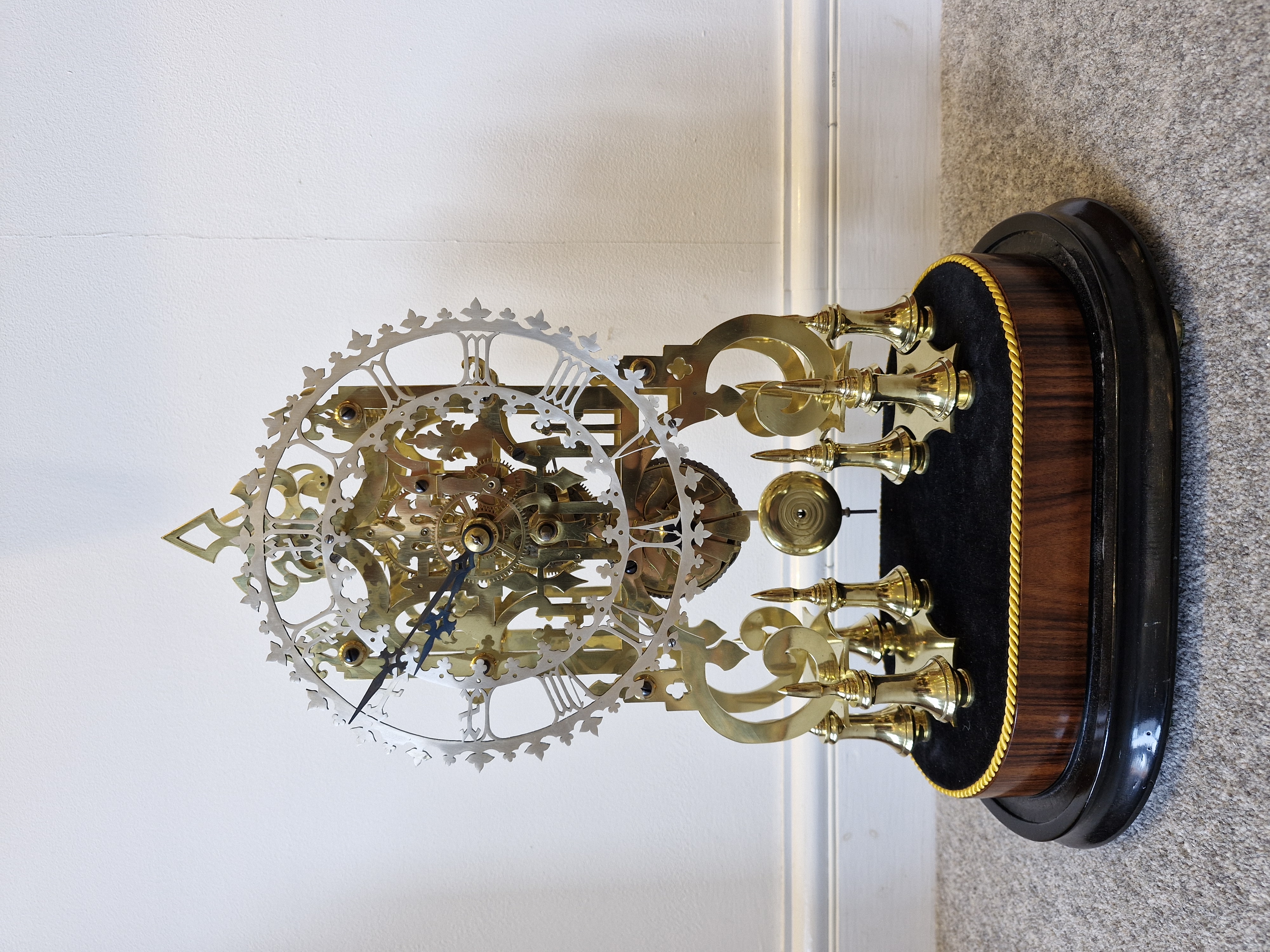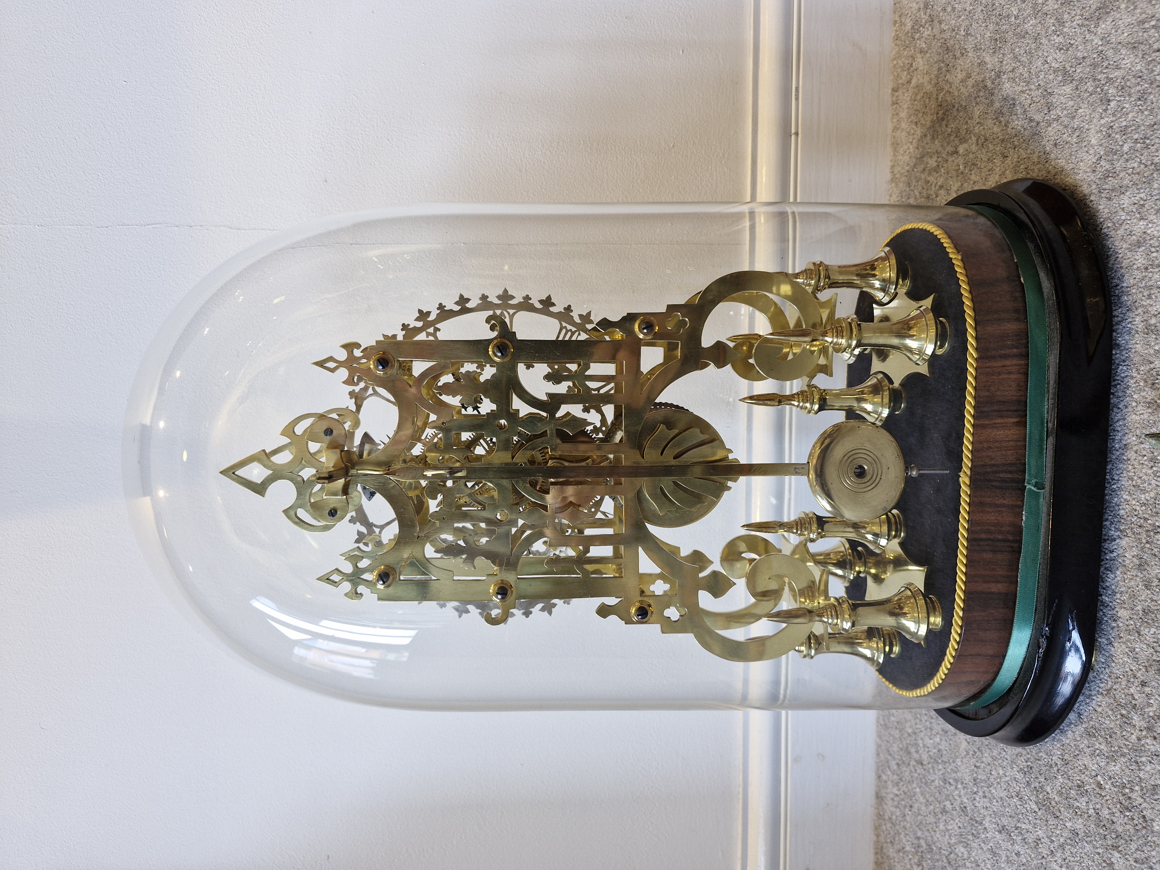 This is a nicely proportioned Gothic style Victorian skeleton clock estimated to date from around C1875.  The fully restored fusee movement sits on a rosewood veneered platform that locates into the glass dome, which in turn sits on an ebonised base, with turned brass feet.  The dome appears original and with no flaws or cracks. The clock movement features nicely designed decorative plates fretted out by hand, chain driven fusee, five spoke wheels, and a fretted out silvered skeletonised chapter ring. This clock is a timepiece only and does not strike.